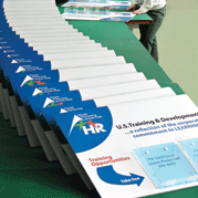 Lobby literature holders cover our production area as we make the final inspection. The posters will be placed on easels throughout the company’s different locations to promote up and coming events.